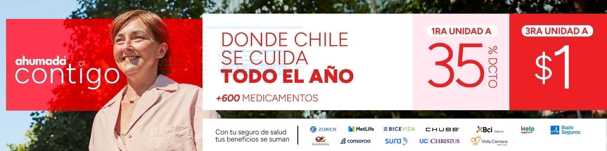 Porque en Farmacias Ahumada entendemos que la continuidad del tratamiento de un paciente crónico es lo más importante, tendrás la 3ra unidad a $1 ¡todos los días! en más de 600 medicamentos de uso crónico en 10 patologías. Además, siempre, la 1 ra unidad con 35% dcto.