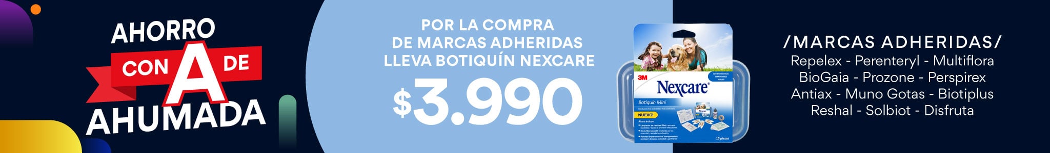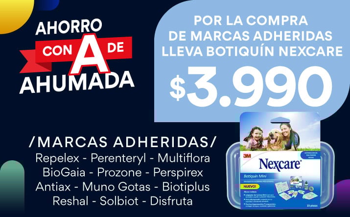 Por la compra de productos de marcas adheridas, compra una unidad de Botiquin Nexcare a $3.990 válido para todo público, por compras realizadas por personas naturales, consumidores finales, con cualquier medio de pago entre los días 30 de diciembre de 2025 y 5 de enero de 2026, ambos días inclusive o hasta agotar el stock de 1.000 unidades por producto seleccionado. Beneficio o descuento exclusivo para compras presenciales realizadas en farmacias de Farmacias Ahumada SpA y para compras realizadas a través del sitio web www.farmaciasahumada.cl. Descuento no aplica para compra de packs o estuches. Beneficios o descuentos no acumulables entre sí ni con otras ofertas, promociones, programas, convenios y/o descuentos. La venta de productos y/o medicamentos quedarán sujetas a la disponibilidad de stock de cada farmacia. Verifique términos, condiciones y stock en www.farmaciasahumada.cl.