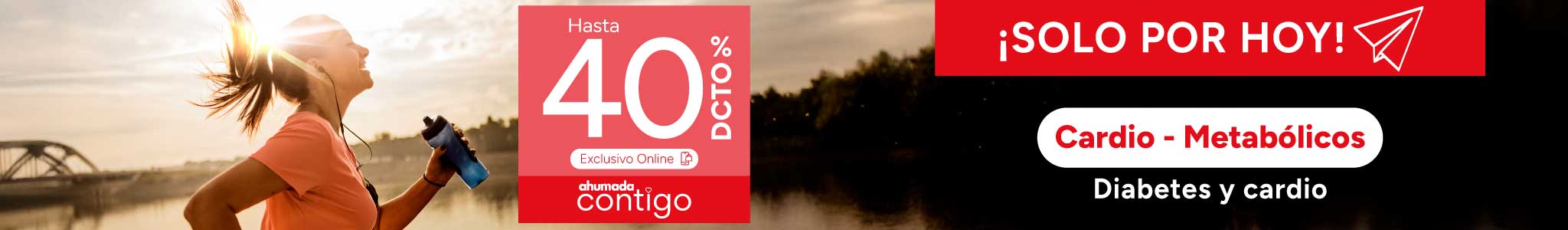 Beneficio de hasta 40% de descuento en la compra de medicamentos seleccionados de la categoría Cardiometabolicos válido para miembros vigentes del programa Ahumada Contigo de Farmacias Ahumada SpA, por compras realizadas por personas naturales, consumidores finales que registran su compra a través del programa con su cédula de identidad vigente, con cualquier medio de pago el día 23 de marzo de 2026, o hasta agotar el stock de 1.000 unidades por producto seleccionado. Beneficio aplicable a compras realizadas a través del sitio web www.farmaciasahumada.cl y compras presenciales en farmacias de Farmacias Ahumada SpA. Dispensación de medicamentos según normativa sanitaria vigente. NO SE AUTOMEDIQUE. Consulte a su químico farmacéutico. Productos sujetos a reposición de cada local. Beneficios o descuentos no acumulables entre sí ni con otras ofertas, promociones, descuentos, beneficios, programas o convenios. Consulte por términos, condiciones, exclusiones, limitaciones, despachos, productos y su stock en www.farmaciasahumada.cl