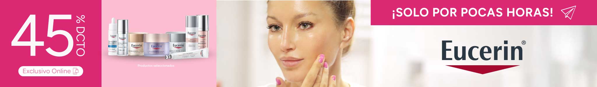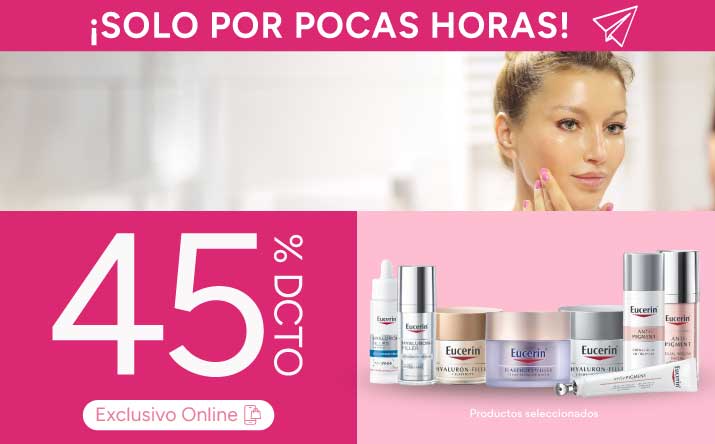 45% de descuento en la compra de productos seleccionados de la marca Eucerin válido para todo público, por compras realizadas con cualquier medio de pago el día 28 de marzo de 2026 o hasta agotar el stock de 1000 unidades por producto seleccionado. Descuento aplicable en compras realizadas en el sitio web www.farmaciasahumada.cl. Productos sujetos a reposición de cada local. Descuentos no acumulables entre sí ni con otras ofertas, promociones, descuentos, beneficios, programas o convenios. Consulte por términos, condiciones, exclusiones, limitaciones, despachos, productos y su stock en www.farmaciasahumada.cl.