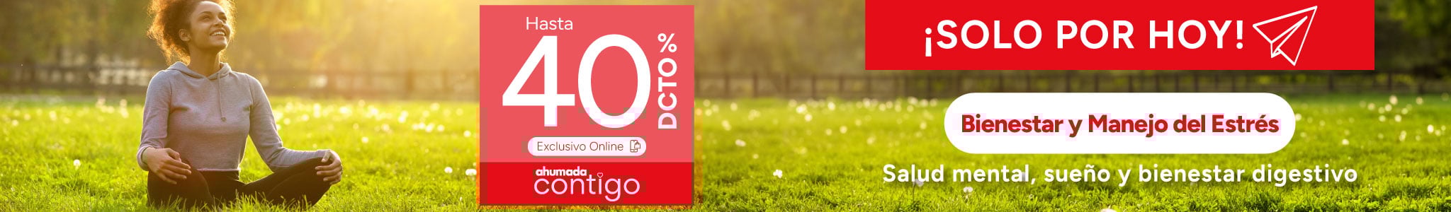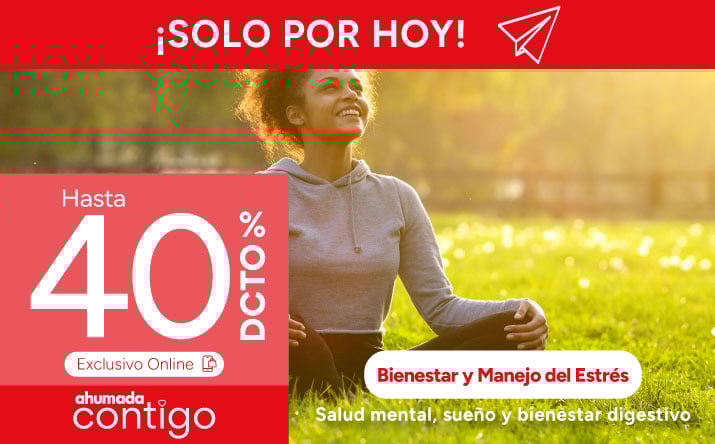 Beneficio de hasta 40% de descuento en la compra de medicamentos seleccionados de la categoría Bienestar y manejo del estrés válido para miembros vigentes del programa Ahumada Contigo de Farmacias Ahumada SpA, por compras realizadas por personas naturales, consumidores finales que registran su compra a través del programa con su cédula de identidad vigente, con cualquier medio de pago el día 20 de abril de 2026, o hasta agotar el stock de 1.000 unidades por producto seleccionado. Beneficio aplicable a compras realizadas a través del sitio web www.farmaciasahumada.cl y compras presenciales en farmacias de Farmacias Ahumada SpA. Dispensación de medicamentos según normativa sanitaria vigente. NO SE AUTOMEDIQUE. Consulte a su químico farmacéutico. Productos sujetos a reposición de cada local. Beneficios o descuentos no acumulables entre sí ni con otras ofertas, promociones, descuentos, beneficios, programas o convenios. Consulte por términos, condiciones, exclusiones, limitaciones, despachos, productos y su stock en www.farmaciasahumada.cl