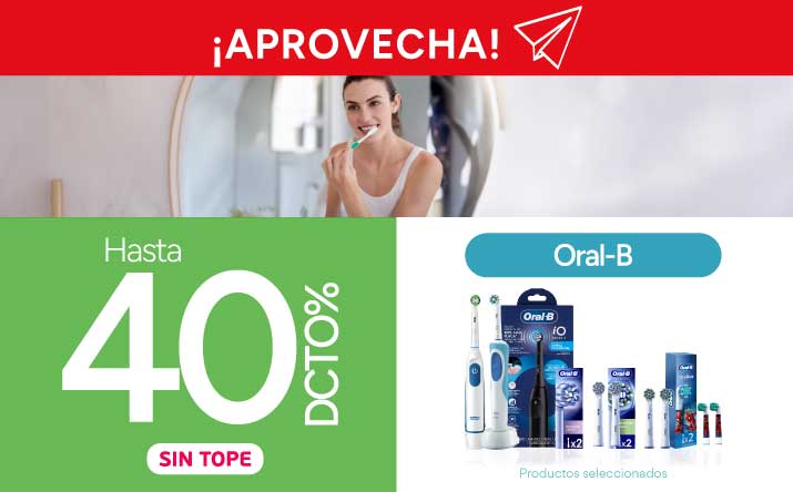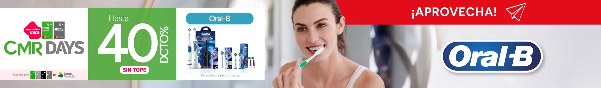 Beneficio de hasta 40% de descuento en la compra de productos seleccionados de la marca oral-B realizadas a través de la página web www.farmaciasahumada.cl y compras realizadas de forma presencial en farmacias de Farmacias Ahumada SpA. Beneficios válidos entre los días 27 de enero de 2026 y 29 de enero de 2026, ambos días inclusive o hasta agotar el stock de 1.000 unidades. Beneficios y/o descuentos no acumulables entre sí ni con otras ofertas, promociones, programas, convenios y/o descuentos. Beneficio aplicable sólo a personas naturales, consumidores finales que paguen el total de la boleta con tarjetas emitidas por promotora CMR Falabella S.A. o tarjetas de débito de Banco Falabella. Se excluyen packs o estuches de productos. La venta de productos quedará sujeta a disponibilidad de stock de cada farmacia. Descuento se realizará al momento de pagar y es de exclusiva responsabilidad del establecimiento. Acumulación y canje de puntos por compras realizadas con tarjetas emitidas por Promotora CMR Falabella S.A. o tarjeta de débito de Banco Falabella sujeto a términos y condiciones establecidos en el Reglamento del Programa de CMR Puntos vigentes disponible en www.cmrpuntos.cl. El pago con tarjetas de crédito puede tener costos asociados. Consultar al emisor para más información. Infórmese sobre la garantía estatal de los depósitos en su banco o www.cmfchile.cl. Verifique términos, condiciones, productos y su stock en www.farmaciasahumada.cl.