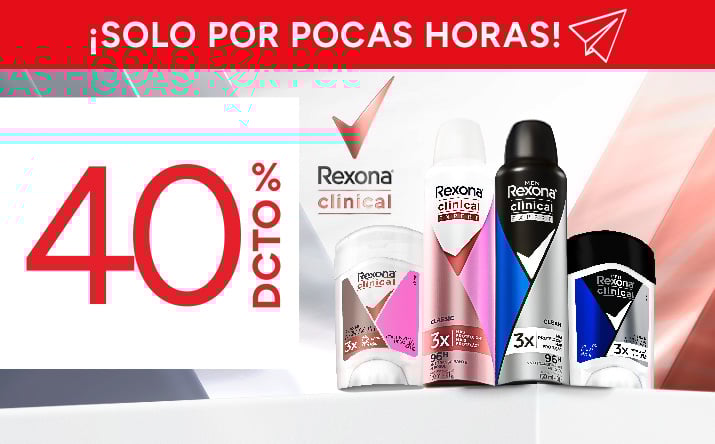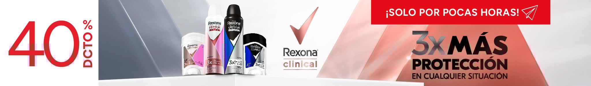 40% de descuento en la compra de productos seleccionados de la marca Rexona clínical válido para todo público, por compras realizadas con cualquier medio de pago desde el 28 de abril de 2026 hasta el 30 de abril de 2026, ambos días inclusive o hasta agotar el stock de 1000 unidades por producto seleccionado. Descuento aplicable para compras realizadas en el sitio web www.farmaciasahumada.cl. Beneficio no aplica para comprar packs o estuches de productos. Productos sujetos a reposición de cada local. Beneficios o descuentos no acumulables entre sí ni con otras ofertas, promociones, descuentos, beneficios, programas o convenios. Consulte por términos, condiciones, exclusiones, limitaciones, despachos, productos y su stock en www.farmaciasahumada.cl.