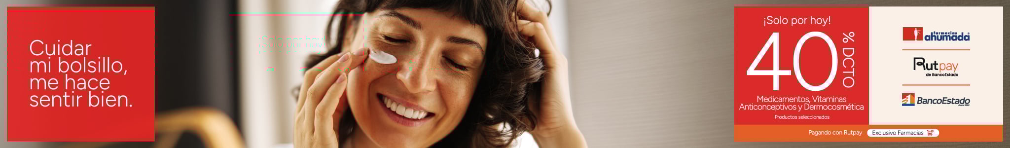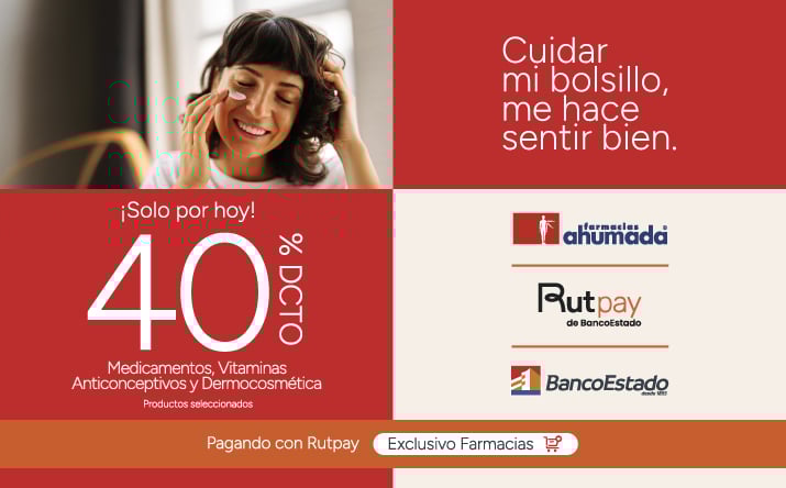 Beneficio de 40% de descuento en la compra de medicamentos y vitaminas y dermocosmética productos seleccionados válido para todo público, por compras realizadas por personas naturales, consumidores finales, pagando con la aplicación RUTPAY todos los días viernes entre el 1 de abril de 2026 y 30 de abril de 2026, ambos días inclusive o hasta agostar stock de 1.000 unidades por producto seleccionado. Beneficio aplicable a compras presenciales en farmacias de Farmacias Ahumada SpA. Beneficios o descuentos no acumulables entre sí ni con otras ofertas, promociones, programas, convenios y/o descuentos. Tope descuento de $20.000 por transacción en productos seleccionados. Beneficio limitado a tres transacciones al día por RUT. El descuento del 40% se compone de un 22,5% de descuento entregado por Farmacias Ahumada más un 17,5% descuento adicional por pagar a través de la aplicación “Rutpay”. Dispensación de medicamentos según normativa sanitaria vigente. NO SE AUTOMEDIQUE. Consulte a su químico farmacéutico. Verifique términos, condiciones, productos y stock en www.farmaciasahumada.cl