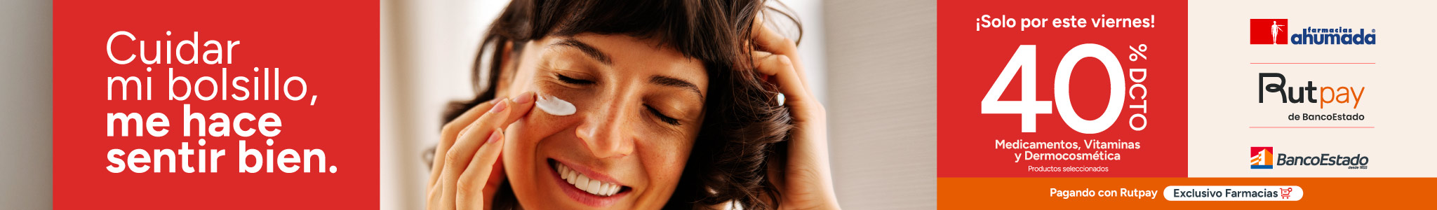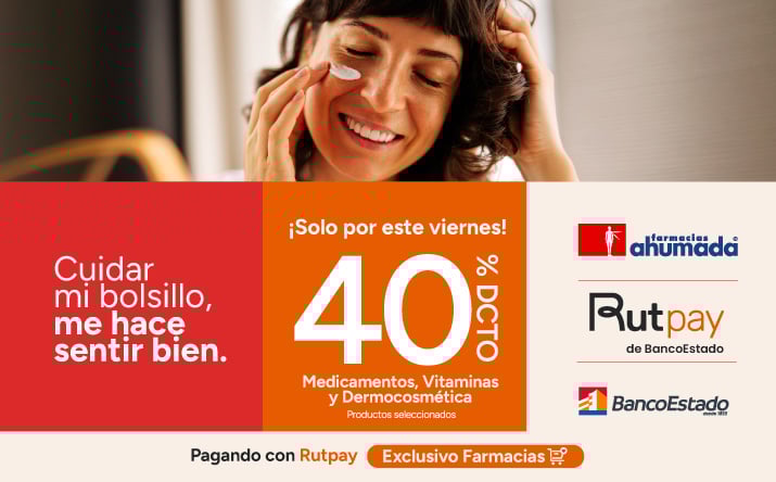 Beneficio de 40% de descuento en la compra de medicamentos y vitaminas seleccionados válido para todo público, por compras realizadas por personas naturales, consumidores finales, pagando con la aplicación RUTPAY todos los días viernes entre el 02 de enero de 2026 y 30 de enero de 2026, ambos días inclusive o hasta agostar stock de 1.000 unidades por producto seleccionado. Beneficio aplicable a compras presenciales en farmacias de Farmacias Ahumada SpA. Beneficios o descuentos no acumulables entre sí ni con otras ofertas, promociones, programas, convenios y/o descuentos. Tope descuento de $20.000 por transacción en productos seleccionados. Beneficio limitado a tres transacciones al día por RUT. El descuento del 40% se compone de un 22,5% de descuento entregado por Farmacias Ahumada más un 17,5% descuento adicional por pagar a través de la aplicación “Rutpay”. Dispensación de medicamentos según normativa sanitaria vigente. NO SE AUTOMEDIQUE. Consulte a su químico farmacéutico. Verifique términos, condiciones, productos y stock en www.farmaciasahumada.cl