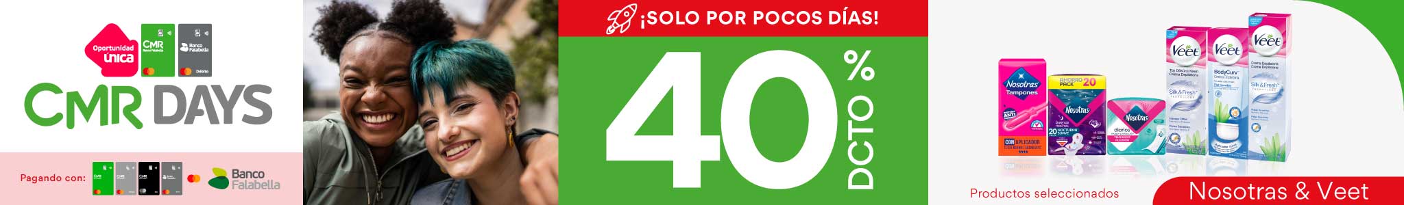 Beneficio de 40% de descuento en la compra de productos seleccionados de la marca Veet y nosotras a través de la página web www.farmaciasahumada.cl y compras realizadas de forma presencial en farmacias de Farmacias Ahumada SpA. Beneficios válidos entre los días 3 y 4 de febrero de 2026, ambos días inclusive o hasta agotar el stock de 1.000 unidades. Beneficios y/o descuentos no acumulables entre sí ni con otras ofertas, promociones, programas, convenios y/o descuentos. Beneficio aplicable sólo a personas naturales, consumidores finales que paguen el total de la boleta con tarjetas emitidas por promotora CMR Falabella S.A. o tarjetas de débito de Banco Falabella. Se excluyen packs o estuches de productos. La venta de productos quedará sujeta a disponibilidad de stock de cada farmacia. Descuento se realizará al momento de pagar y es de exclusiva responsabilidad del establecimiento. Acumulación y canje de puntos por compras realizadas con tarjetas emitidas por Promotora CMR Falabella S.A. o tarjeta de débito de Banco Falabella sujeto a términos y condiciones establecidos en el Reglamento del Programa de CMR Puntos vigentes disponible en www.cmrpuntos.cl. El pago con tarjetas de crédito puede tener costos asociados. Consultar al emisor para más información. Infórmese sobre la garantía estatal de los depósitos en su banco o www.cmfchile.cl. Verifique términos, condiciones, productos y su stock en www.farmaciasahumada.cl.