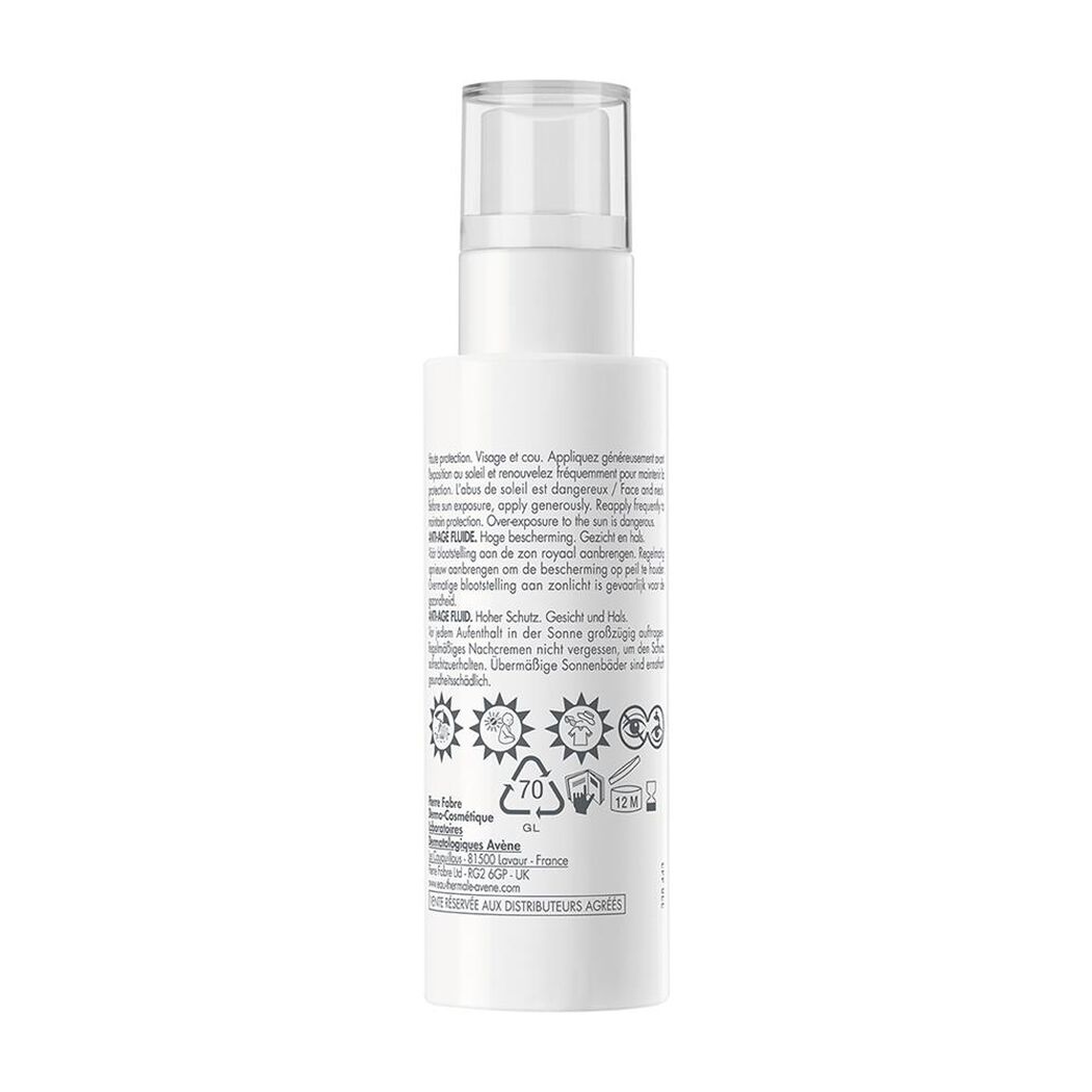 Protector Solar Avène Anti-Age Fluido FPS 50 ofrece alta protección solar con beneficios antiedad, ideal para uso diario en pieles sensibles. Categoría: cosmético dermatológico. Vía de uso: tópica.